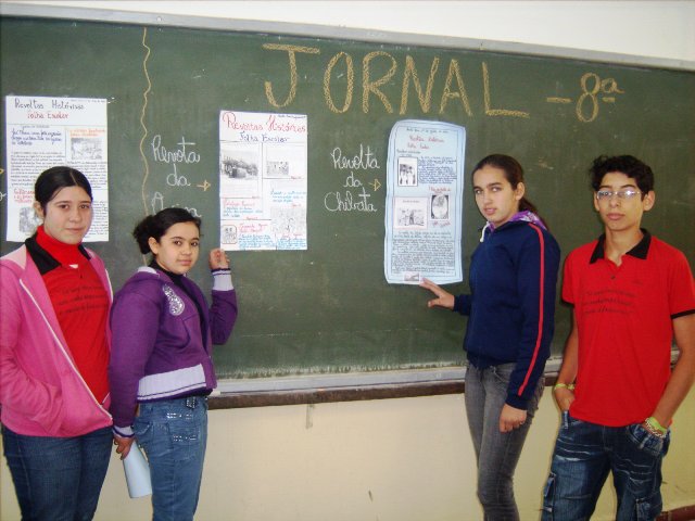 Com o objetivo de incentivar a discussão sobre os movimentos de contestação à ordem oligárquica, durante a República Velha, tanto nas áreas rurais quanto urbanas, a professora de História Maria Silvia Biglia Lobo desenvolveu um trabalho de pesquisa com os alunos da 8ª série. Em equipes buscaram informações, selecionaram e organizaram o conteúdo para montagem de uma página de jornal. Depois de todo material pronto, foi a vez da apresentação. Cada grupo apresentou o trabalho estabelecendo uma relação entre os temas formando um panorama completo sobre os movimentos sociopolíticos da República velha.